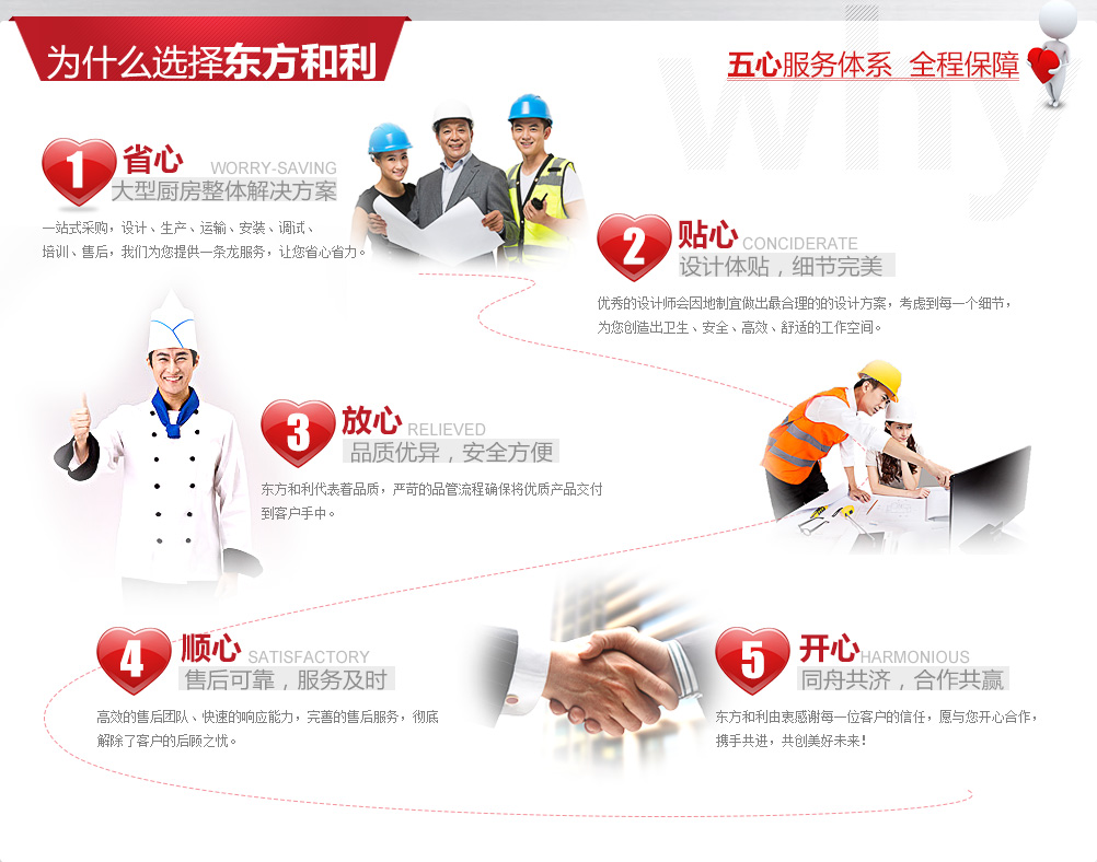廚房工程建設(shè)是一項(xiàng)龐大復(fù)雜的系統(tǒng)工程,既需要與后勤工作人員、廚師溝通協(xié)調(diào), 又要與土建、裝修、機(jī)電、暖通等工程人員相互配合,工作量十分巨大。同時(shí)還要采購眾多的食品機(jī)械、工具,這對(duì)沒有相關(guān)經(jīng)驗(yàn)的我們來說確實(shí)是一個(gè)挑戰(zhàn)。有時(shí)候我們面對(duì)廚師提出的長長的采購需求清單就已經(jīng)眼花繚亂了。 幸好東方和利提供的是整體解決方案,從前期的設(shè)計(jì)咨詢到后期的安裝調(diào)試、從大型設(shè)備到餐具小件,包括各種食品機(jī)械,排煙通風(fēng),這些瑣碎事情都由東方和利來完成,為我們提供量身定制的解決方案。一站式采購為我們節(jié)省了大量精力,而且所有廚具都由東方和利來保修,對(duì)我們來說也更加方便。總之,東方和利的服務(wù)讓我們非常省心,我很滿意。